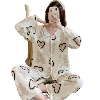 ชุดนอนแขนยาวสำหรับผู้หญิง, ชุดนอนผ้าฝ้ายนมพิมพ์ลายน่ารักชุดนอนสำหรับใส่อยู่บ้านดีไซน์ใหม่